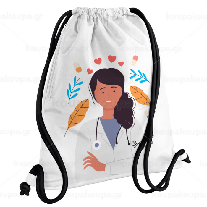 Ευχαριστώ για όλα γιατρέ, Τσάντα πλάτης πουγκί GYMBAG λευκή, με τσέπη (40x48cm) & χονδρά κορδόνια