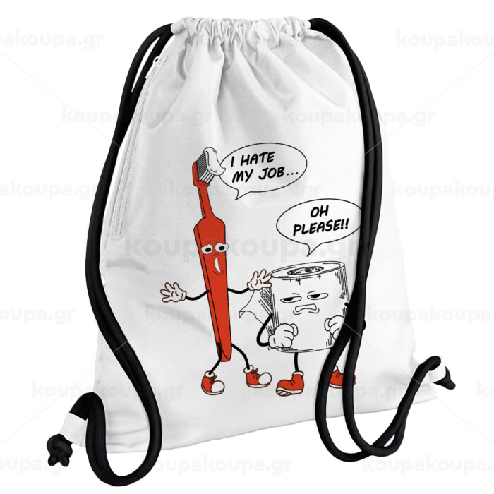 I hate my job, Τσάντα πλάτης πουγκί GYMBAG λευκή, με τσέπη (40x48cm) & χονδρά κορδόνια