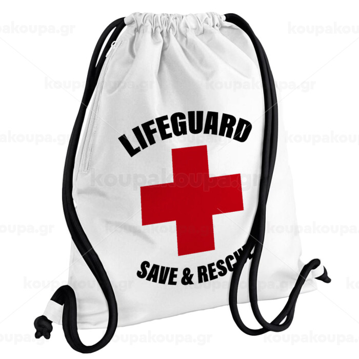Lifeguard Save & Rescue, Τσάντα πλάτης πουγκί GYMBAG λευκή, με τσέπη (40x48cm) & χονδρά κορδόνια
