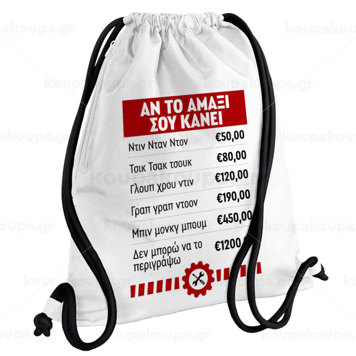 Annoying Noise in Car, Τσάντα πλάτης πουγκί GYMBAG λευκή, με τσέπη (40x48cm) & χονδρά κορδόνια