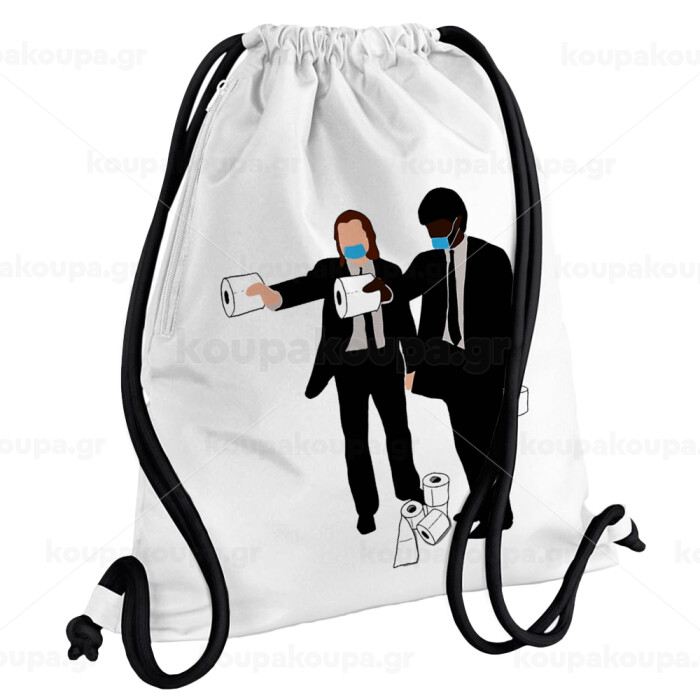 Pulp Fiction 3 meter away, Τσάντα πλάτης πουγκί GYMBAG λευκή, με τσέπη (40x48cm) & χονδρά κορδόνια