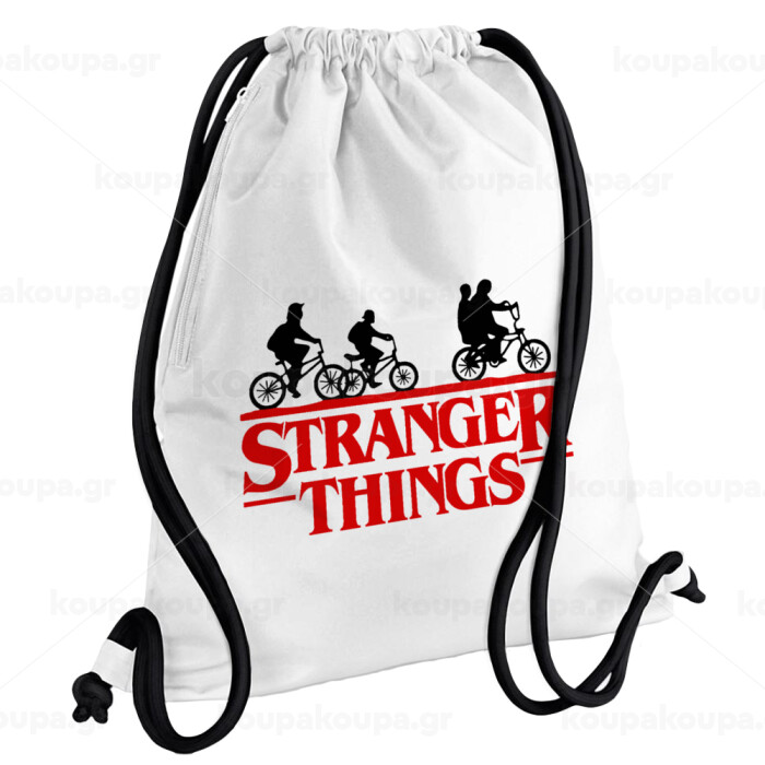 Stranger Things red, Τσάντα πλάτης πουγκί GYMBAG λευκή, με τσέπη (40x48cm) & χονδρά κορδόνια