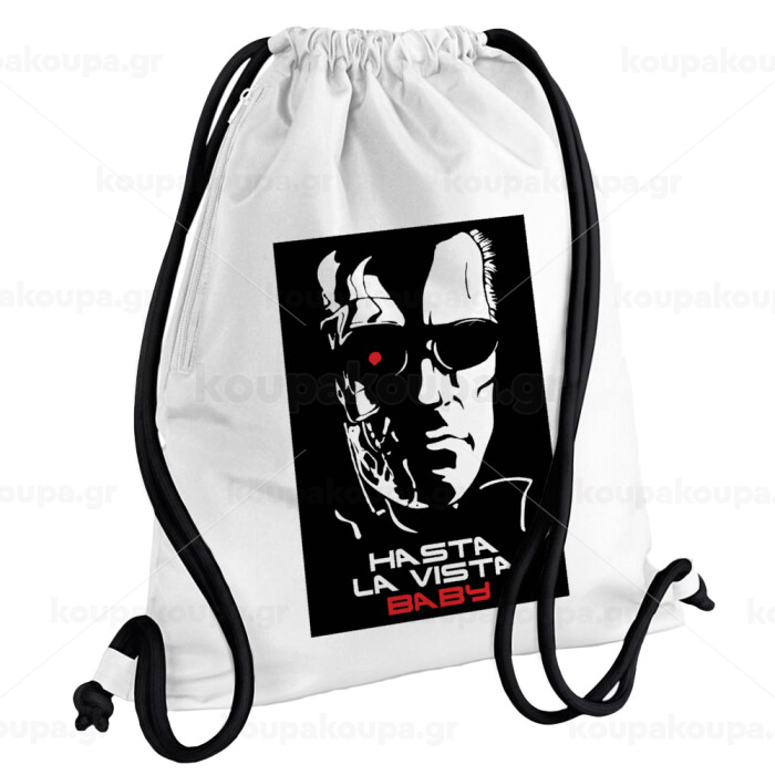 Terminator Hasta La Vista, Τσάντα πλάτης πουγκί GYMBAG λευκή, με τσέπη (40x48cm) & χονδρά κορδόνια