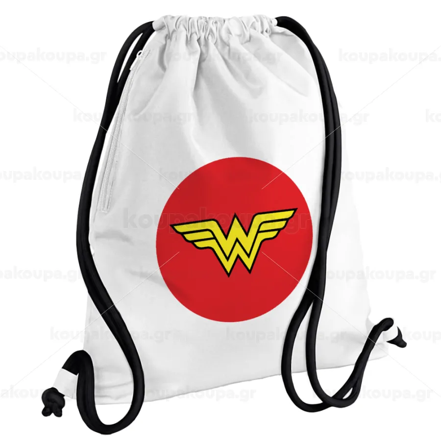 Wonder woman, Τσάντα πλάτης πουγκί GYMBAG λευκή, με τσέπη (40x48cm) & χονδρά κορδόνια