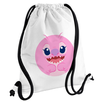 Lilo & Stitch Angel pink, Τσάντα πλάτης πουγκί GYMBAG λευκή, με τσέπη (40x48cm) & χονδρά κορδόνια