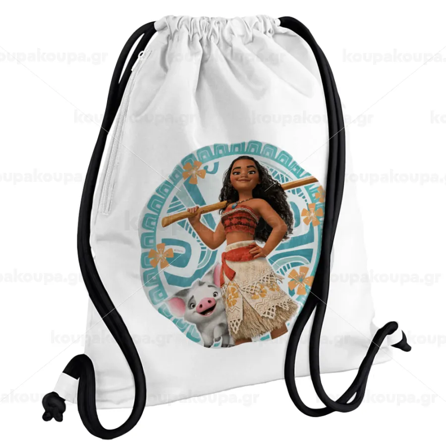 Moana, Τσάντα πλάτης πουγκί GYMBAG λευκή, με τσέπη (40x48cm) & χονδρά κορδόνια