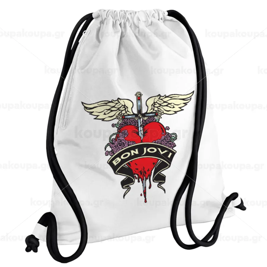 Bon Jovi, Τσάντα πλάτης πουγκί GYMBAG λευκή, με τσέπη (40x48cm) & χονδρά κορδόνια