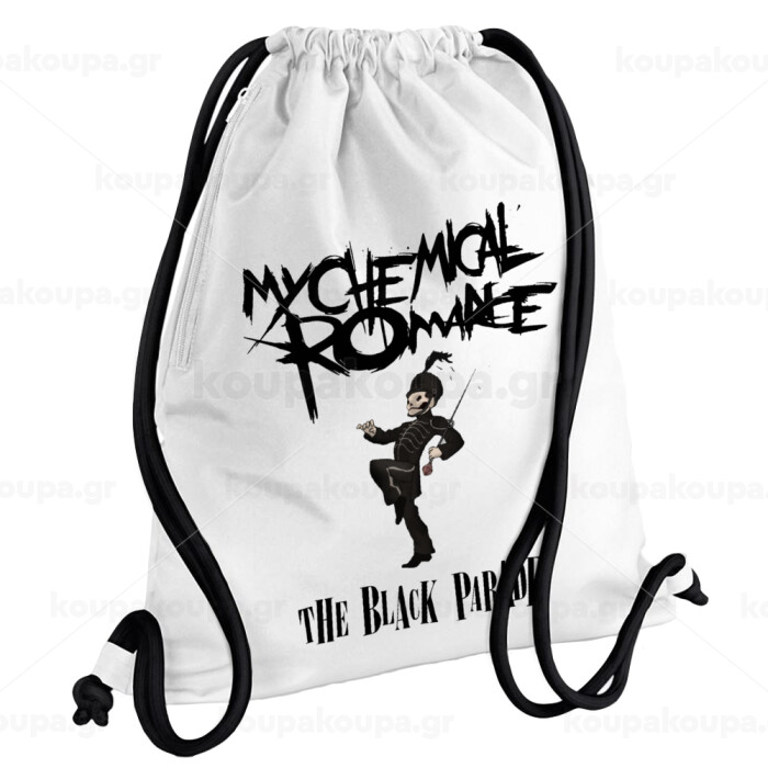 My Chemical Romance Black Parade, Τσάντα πλάτης πουγκί GYMBAG λευκή, με τσέπη (40x48cm) & χονδρά κορδόνια