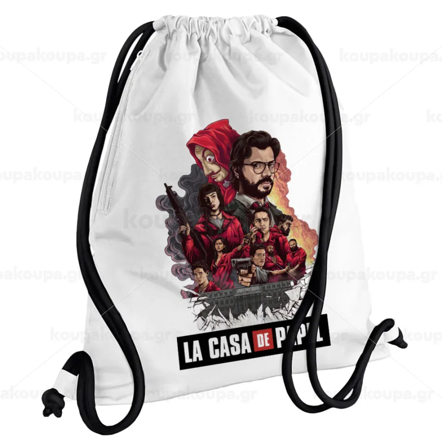 La casa de papel drawing cover, Τσάντα πλάτης πουγκί GYMBAG λευκή, με τσέπη (40x48cm) & χονδρά κορδόνια