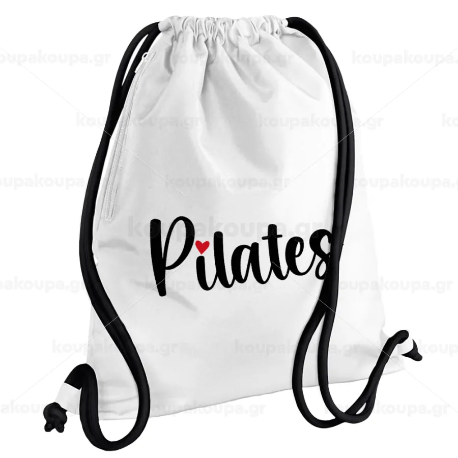 Pilates love, Τσάντα πλάτης πουγκί GYMBAG λευκή, με τσέπη (40x48cm) & χονδρά κορδόνια