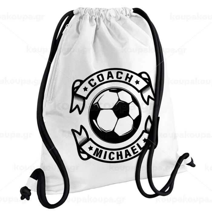 Soccer coach, Τσάντα πλάτης πουγκί GYMBAG λευκή, με τσέπη (40x48cm) & χονδρά κορδόνια