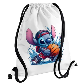 Stitch Basketball, Τσάντα πλάτης πουγκί GYMBAG λευκή, με τσέπη (40x48cm) & χονδρά κορδόνια