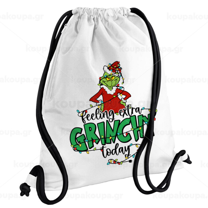 Grinch Feeling Extra Grinchy Today, Τσάντα πλάτης πουγκί GYMBAG λευκή, με τσέπη (40x48cm) & χονδρά κορδόνια