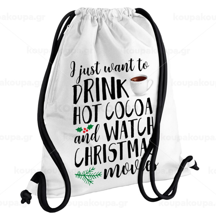 I just want to drink hot cocoa and watch christmas movies, Τσάντα πλάτης πουγκί GYMBAG λευκή, με τσέπη (40x48cm) & χονδρά κορδόνια