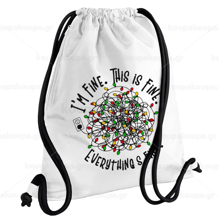 It's Fine I'm Fine Everything Is Fine, Τσάντα πλάτης πουγκί GYMBAG λευκή, με τσέπη (40x48cm) & χονδρά κορδόνια