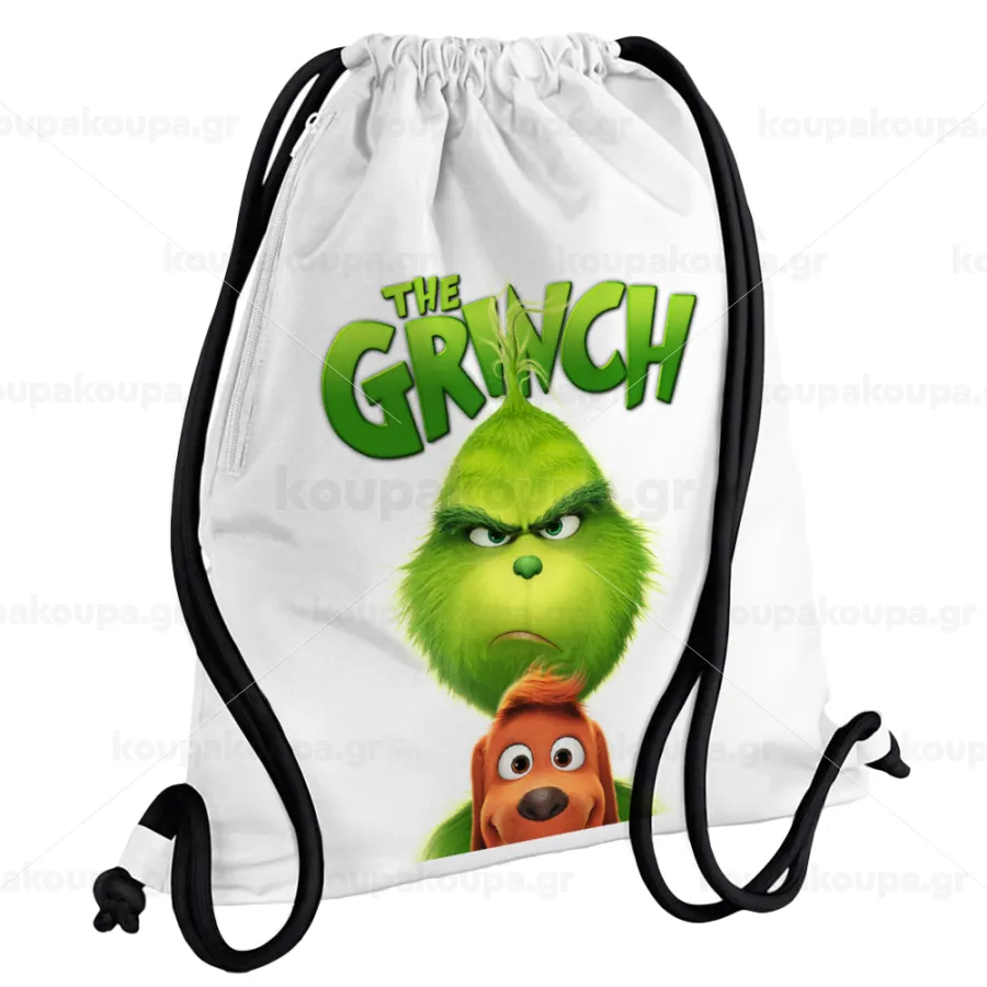 mr grinch, Τσάντα πλάτης πουγκί GYMBAG λευκή, με τσέπη (40x48cm) & χονδρά κορδόνια