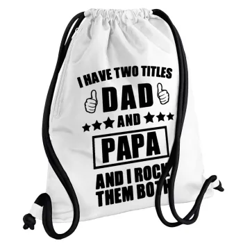 I have two title, DAD & PAPA, Τσάντα πλάτης πουγκί GYMBAG λευκή, με τσέπη (40x48cm) & χονδρά κορδόνια