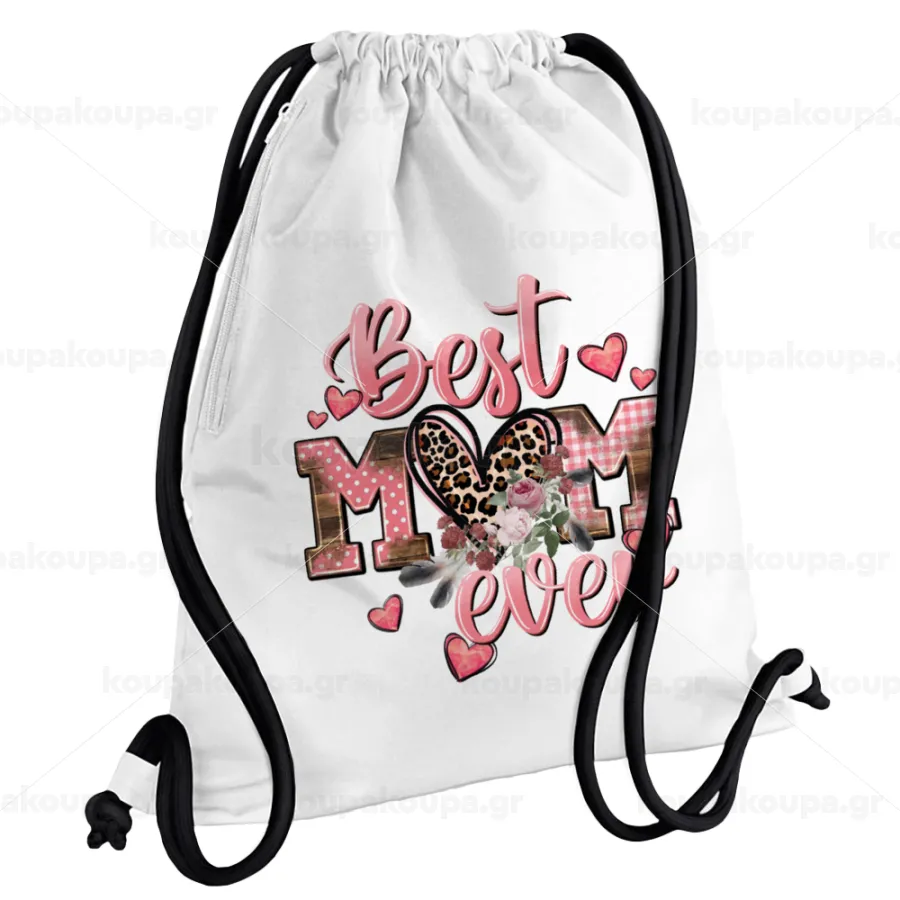 Best mom ever Mother's Day, Τσάντα πλάτης πουγκί GYMBAG λευκή, με τσέπη (40x48cm) & χονδρά κορδόνια