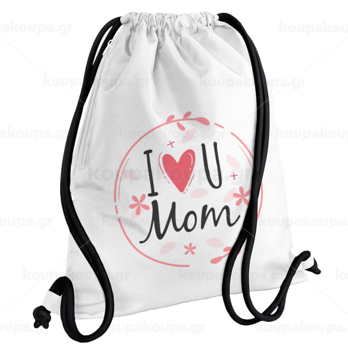 I Love you Mom pink, Τσάντα πλάτης πουγκί GYMBAG λευκή, με τσέπη (40x48cm) & χονδρά κορδόνια