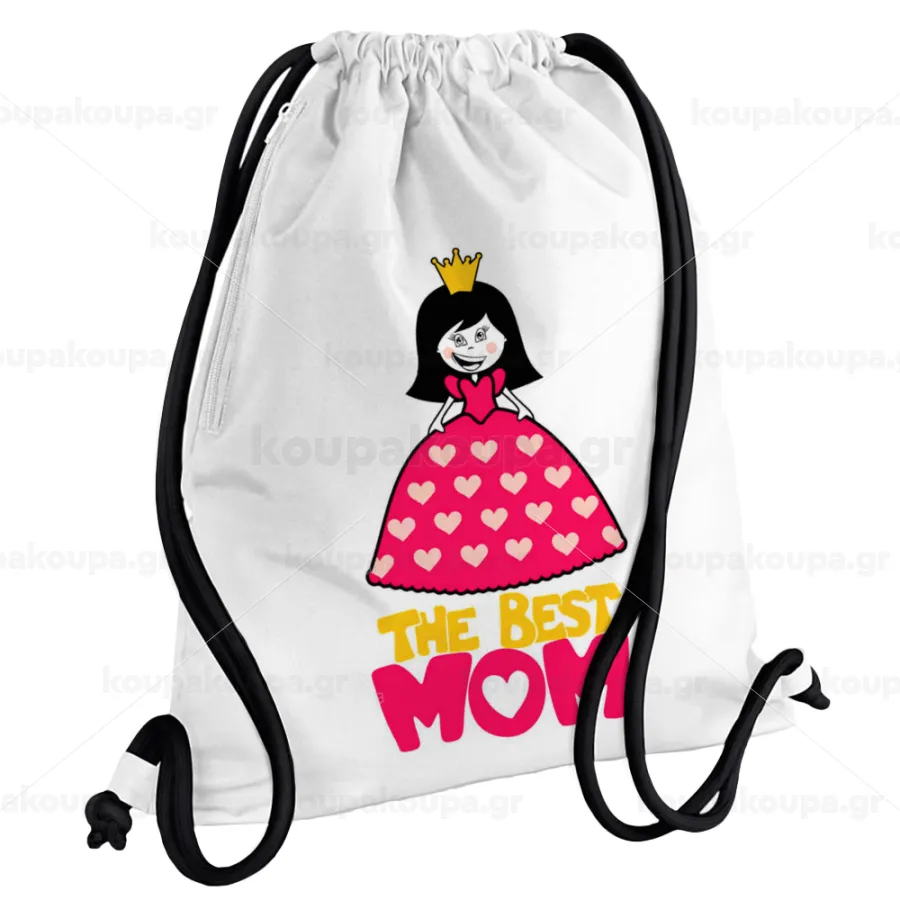 The Best Mom Queen, Τσάντα πλάτης πουγκί GYMBAG λευκή, με τσέπη (40x48cm) & χονδρά κορδόνια