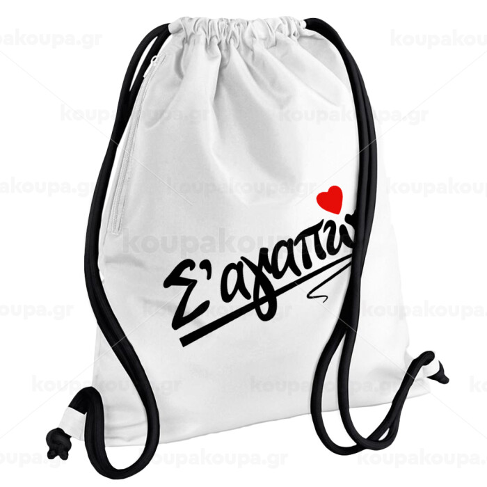Σ΄ αγαπώ!!!, Τσάντα πλάτης πουγκί GYMBAG λευκή, με τσέπη (40x48cm) & χονδρά κορδόνια