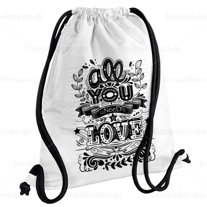 All you need is love, Τσάντα πλάτης πουγκί GYMBAG λευκή, με τσέπη (40x48cm) & χονδρά κορδόνια