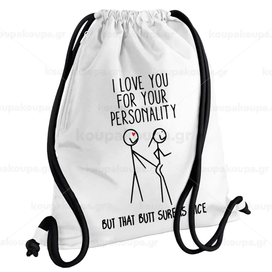 I Love you for your personality, Τσάντα πλάτης πουγκί GYMBAG λευκή, με τσέπη (40x48cm) & χονδρά κορδόνια