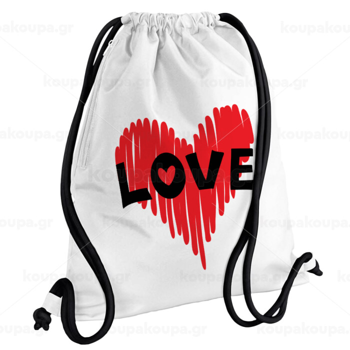 I Love You red heart, Τσάντα πλάτης πουγκί GYMBAG λευκή, με τσέπη (40x48cm) & χονδρά κορδόνια