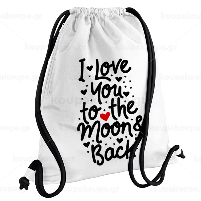 I love you to the moon and back with hearts, Τσάντα πλάτης πουγκί GYMBAG λευκή, με τσέπη (40x48cm) & χονδρά κορδόνια