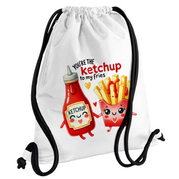Ketchup To My Fries, Τσάντα πλάτης πουγκί GYMBAG λευκή, με τσέπη (40x48cm) & χονδρά κορδόνια