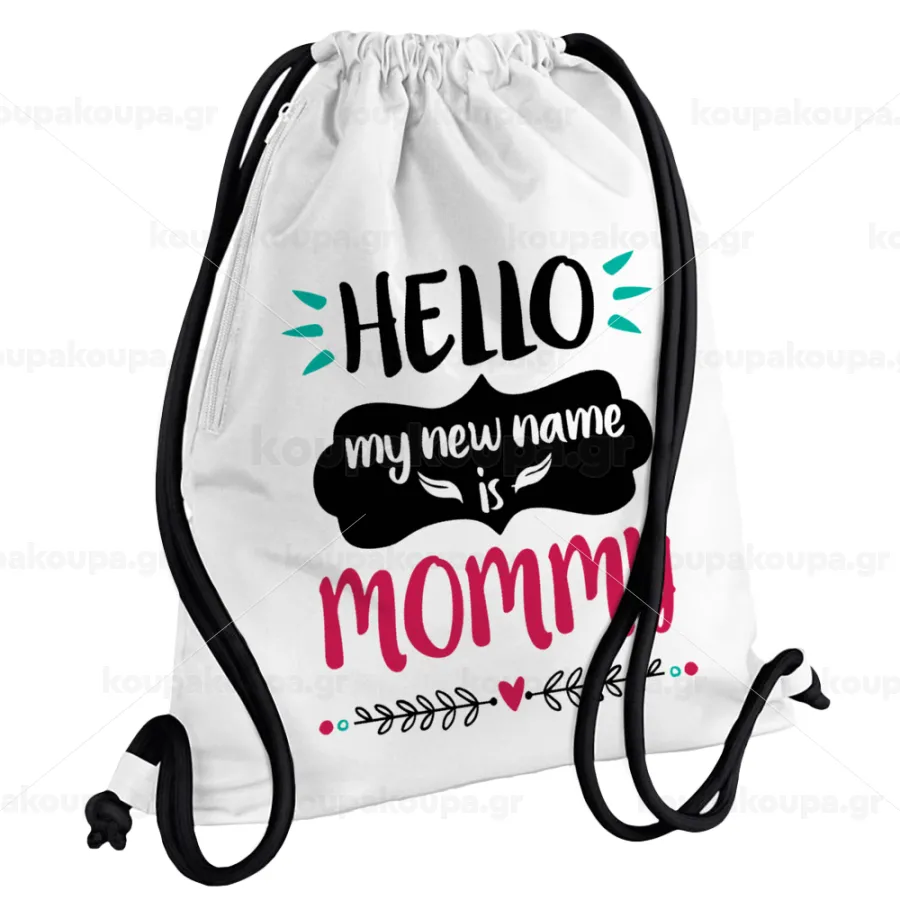 Hello, my new name is Mommy, Τσάντα πλάτης πουγκί GYMBAG λευκή, με τσέπη (40x48cm) & χονδρά κορδόνια
