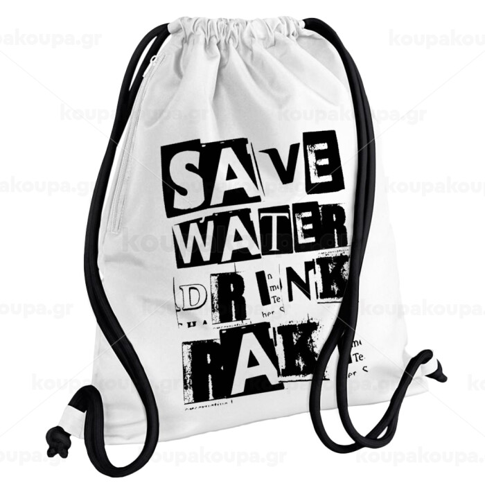 Save Water, Drink RAKI, Τσάντα πλάτης πουγκί GYMBAG λευκή, με τσέπη (40x48cm) & χονδρά κορδόνια