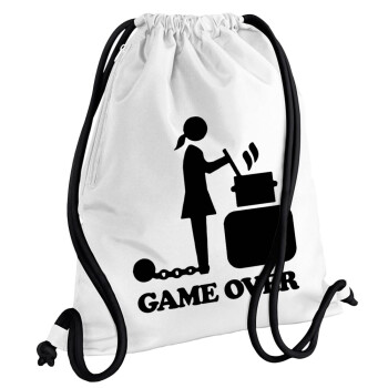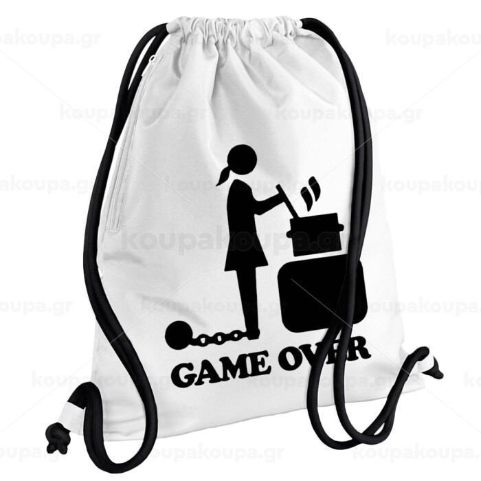 Woman Game Over, Τσάντα πλάτης πουγκί GYMBAG λευκή, με τσέπη (40x48cm) & χονδρά κορδόνια
