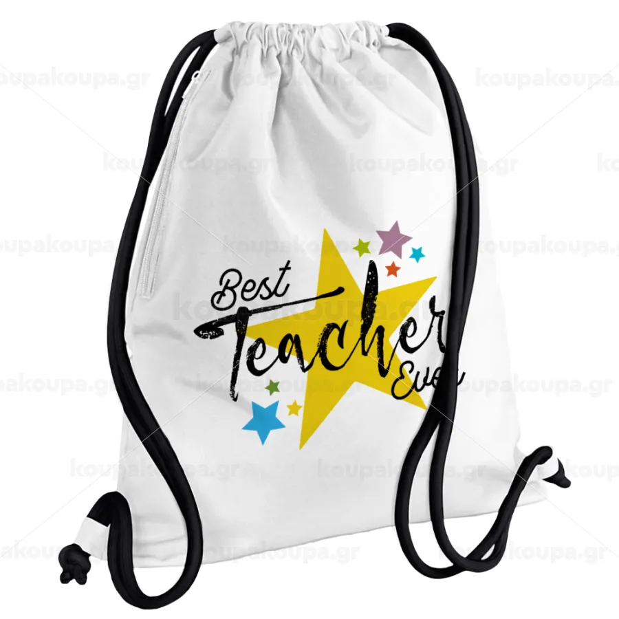 Teacher super star!!!, Τσάντα πλάτης πουγκί GYMBAG λευκή, με τσέπη (40x48cm) & χονδρά κορδόνια