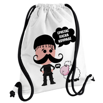 Κρητικός "Έρχεται Πάσχα κουράδι", Τσάντα πλάτης πουγκί GYMBAG λευκή, με τσέπη (40x48cm) & χονδρά κορδόνια
