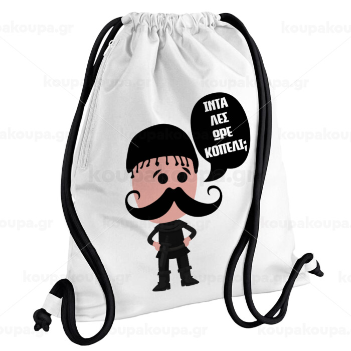 Κρητικός "Ίντα λες ωρέ κοπέλι", Τσάντα πλάτης πουγκί GYMBAG λευκή, με τσέπη (40x48cm) & χονδρά κορδόνια