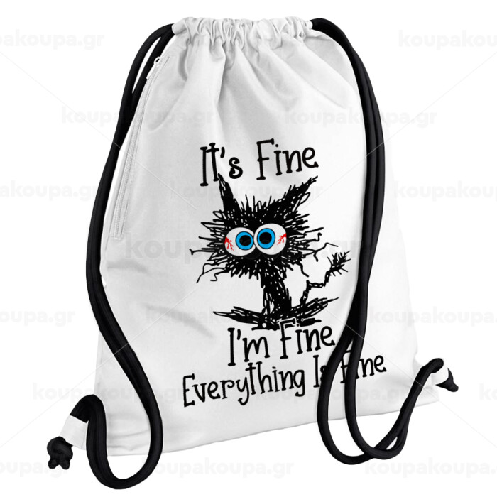 Cat, It's Fine I'm Fine Everything Is Fine, Τσάντα πλάτης πουγκί GYMBAG λευκή, με τσέπη (40x48cm) & χονδρά κορδόνια