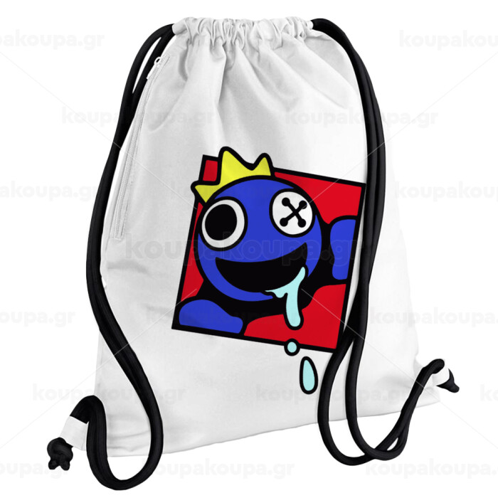 Blue, Rainbow friends, Τσάντα πλάτης πουγκί GYMBAG λευκή, με τσέπη (40x48cm) & χονδρά κορδόνια
