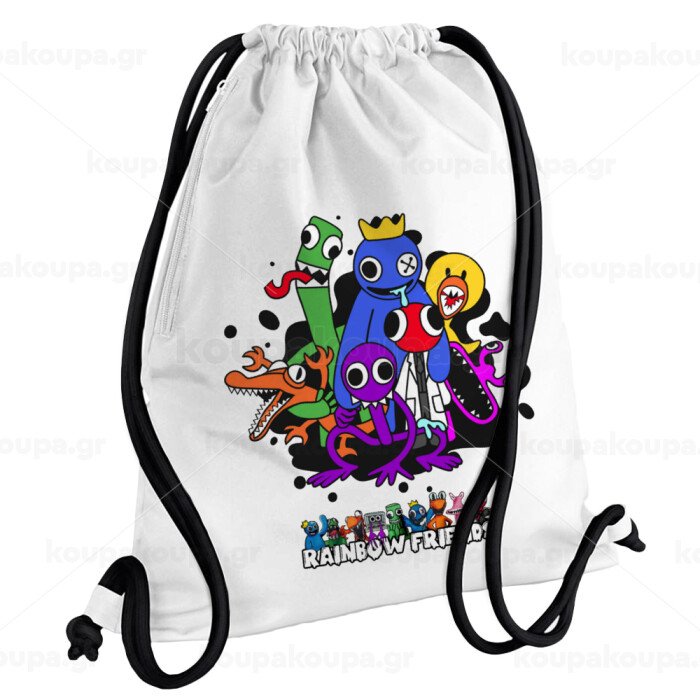 Rainbow friends, Τσάντα πλάτης πουγκί GYMBAG λευκή, με τσέπη (40x48cm) & χονδρά κορδόνια