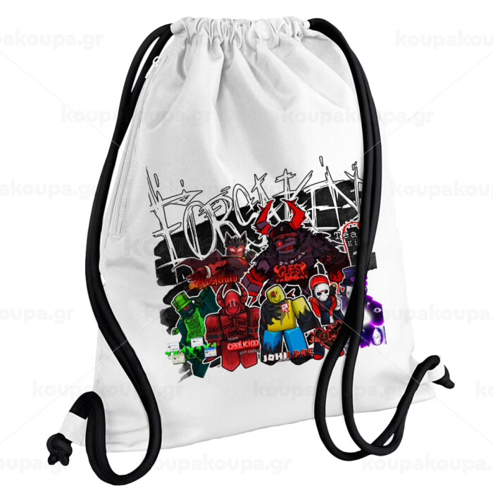 Roblox Forsaken, Τσάντα πλάτης πουγκί GYMBAG λευκή, με τσέπη (40x48cm) & χονδρά κορδόνια