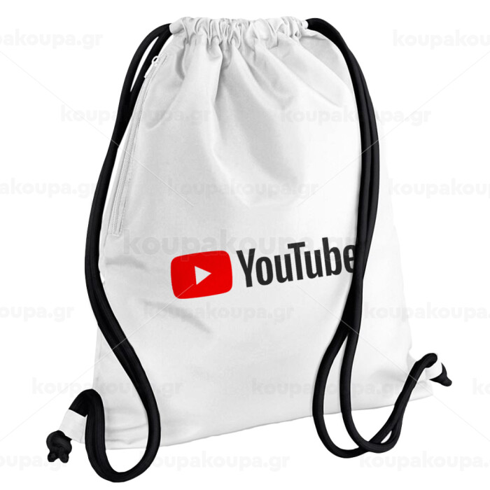 Youtube, Τσάντα πλάτης πουγκί GYMBAG λευκή, με τσέπη (40x48cm) & χονδρά κορδόνια