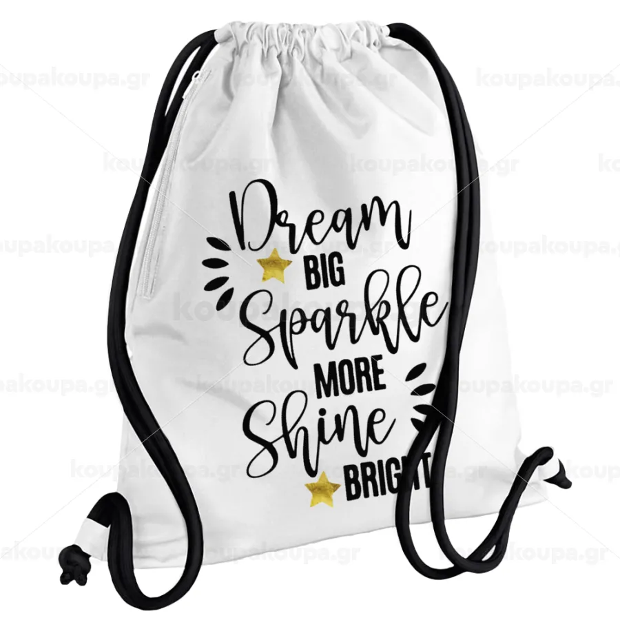Dream big, Sparkle more, Shine bright, Τσάντα πλάτης πουγκί GYMBAG λευκή, με τσέπη (40x48cm) & χονδρά κορδόνια