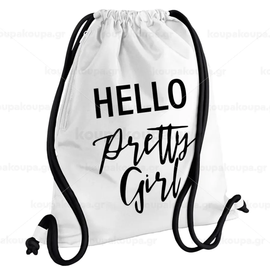 Hello pretty girl, Τσάντα πλάτης πουγκί GYMBAG λευκή, με τσέπη (40x48cm) & χονδρά κορδόνια