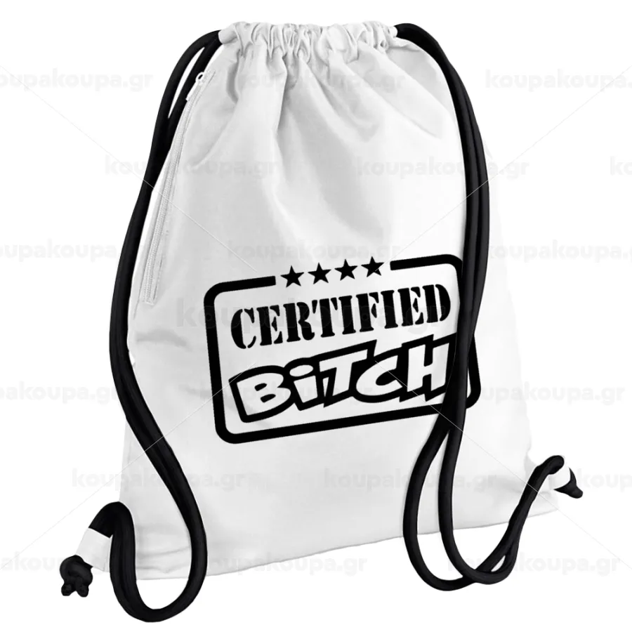 Certified Bitch, Τσάντα πλάτης πουγκί GYMBAG λευκή, με τσέπη (40x48cm) & χονδρά κορδόνια