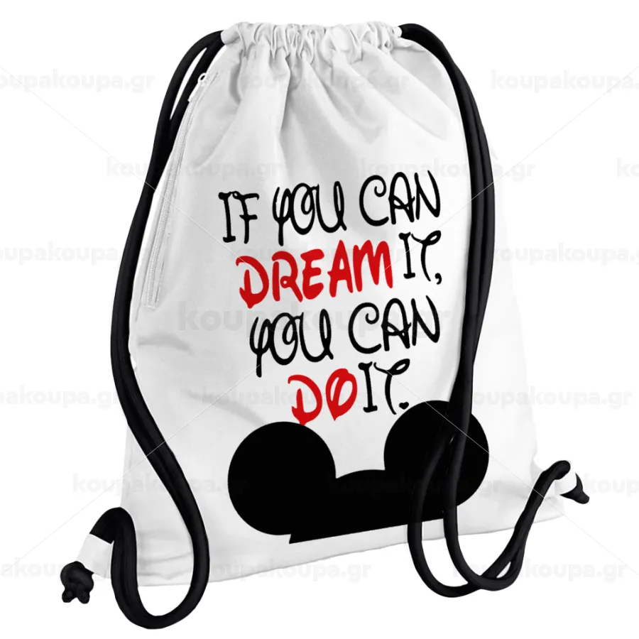 If you can dream it, you can do it, Τσάντα πλάτης πουγκί GYMBAG λευκή, με τσέπη (40x48cm) & χονδρά κορδόνια
