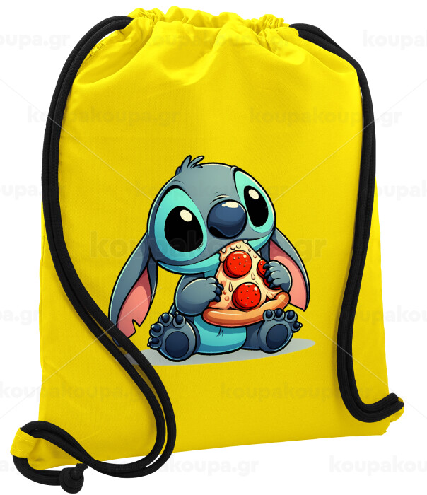 Stitch Pizza, Τσάντα πλάτης πουγκί GYMBAG Κίτρινη, με τσέπη (40x48cm) & χονδρά κορδόνια