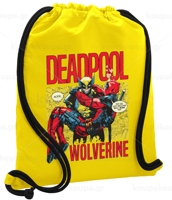 Superhero Deadpool Wolverine, Τσάντα πλάτης πουγκί GYMBAG Κίτρινη, με τσέπη (40x48cm) & χονδρά κορδόνια