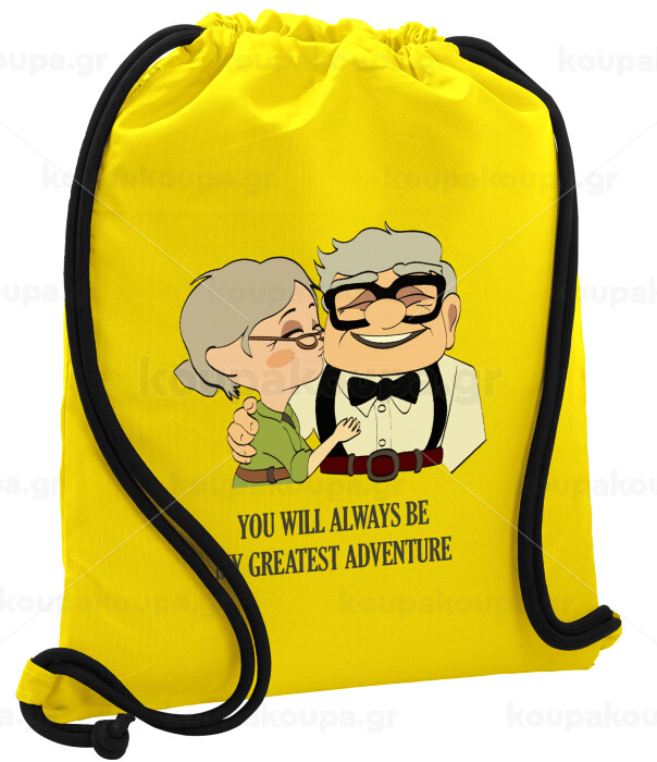 UP, YOU WILL ALWAYS BE MY GREATEST ADVENTURE, Τσάντα πλάτης πουγκί GYMBAG Κίτρινη, με τσέπη (40x48cm) & χονδρά κορδόνια