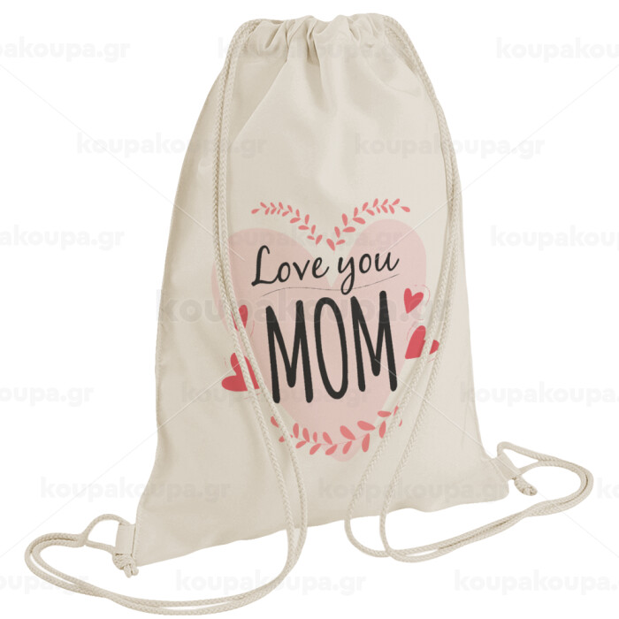 Mother's day I Love you Mom heart, Τσάντα πλάτης πουγκί GYMBAG natural (28x40cm)