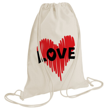 I Love You red heart, Τσάντα πλάτης πουγκί GYMBAG natural (28x40cm)